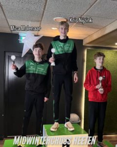 Bij de jongens U14 was er een 3e plek voor Mica Molenaar. Stef Nijzink zat kort achter het podium en werd 5e. Daarachter kwam teamgenoot Nout Overbeek als 7e over de meet. De jongens 10 t/m 12 jaar vochten met name om de 2e plaats, een eind achter een ontketende Daventria-atleet. Ezri Maneschijn eiste hier de 3e plek op. Raf Molenaar werd 5e en Lucas Derksen 7e.