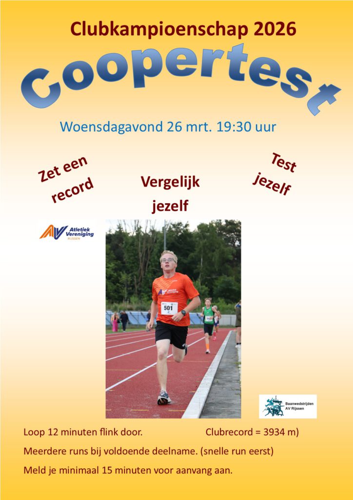 De onderdelen Coopertest, Recordwedstrijd, Loopinstuif, 5 km baan en Engelse Mijl zijn voor AV leden en voor alle inwoners van Rijssen-Holten toegankelijk en gratis.