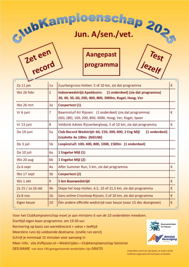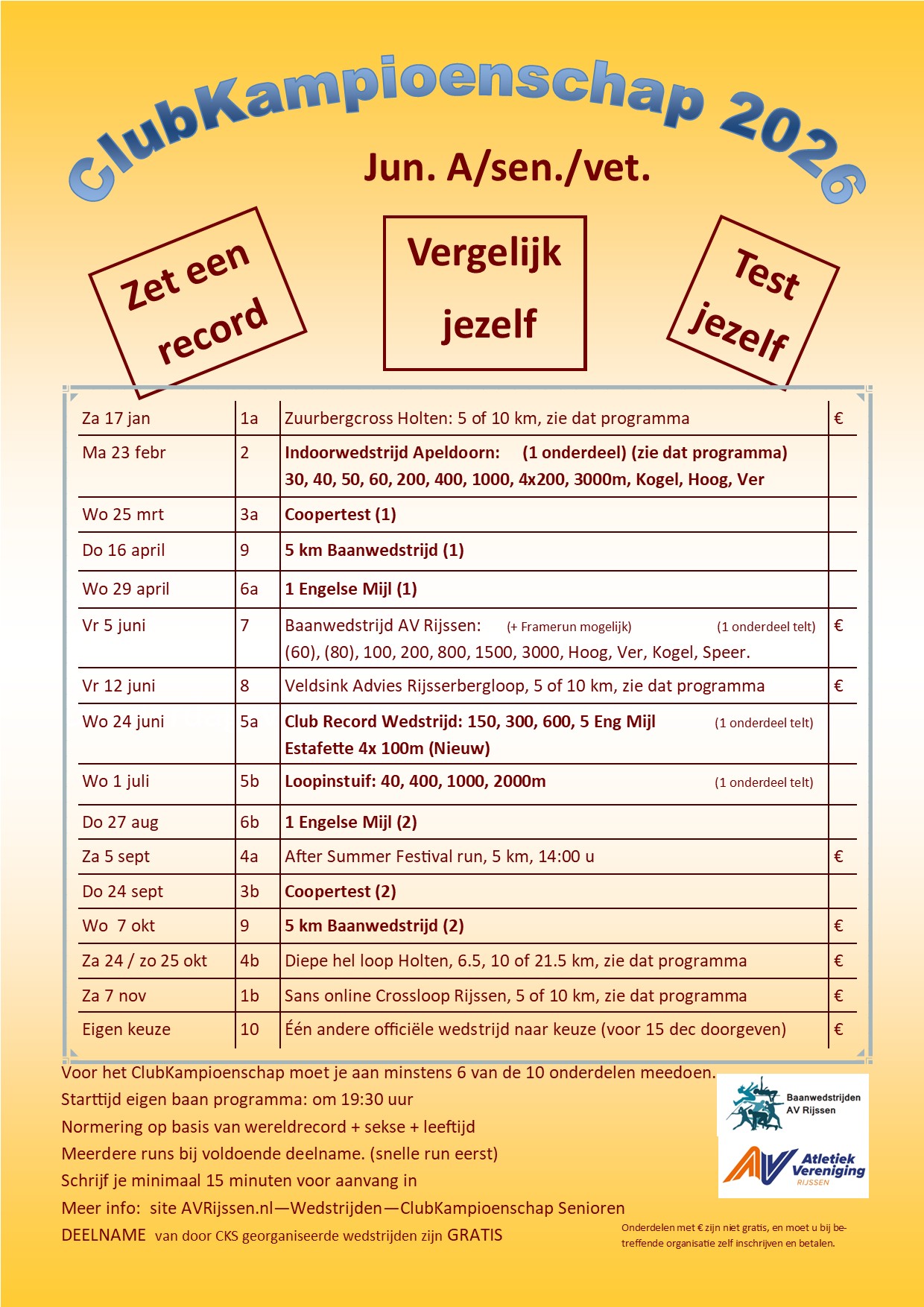 Het clubkampioenschap senioren is voor leden van AV Rijssen in de categorieën: