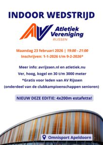 De datum voor de indoorwedstrijd van AV Rijssen 2026 is bekend. Maandagavond 23 februari kan je jouw PR’s aanscherpen in Omnisport Apeldoorn. De inschrijving is open van 1-1-2026 t/m 9-2-2025, neem voor meer informatie alvast een kijkje op atletiek.nu.